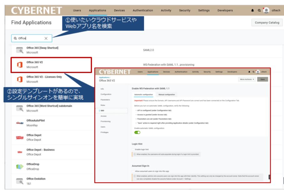 OneLogin App カタログには6,000を超えるクラウドサービス、Webアプリケーションの設定テンプレートが登録されています。管理者は利用したいクラウドサービス・Webアプリケーションのテンプレートを検索して、登録するだけでSAMLによるシングルサインオンや代行入力によるシングルサインオンを簡単に実現できます。Office 365やG suiteであれば、「ワンクリック」でクラウドサービス側の設定も完了できる機能を用意しています。