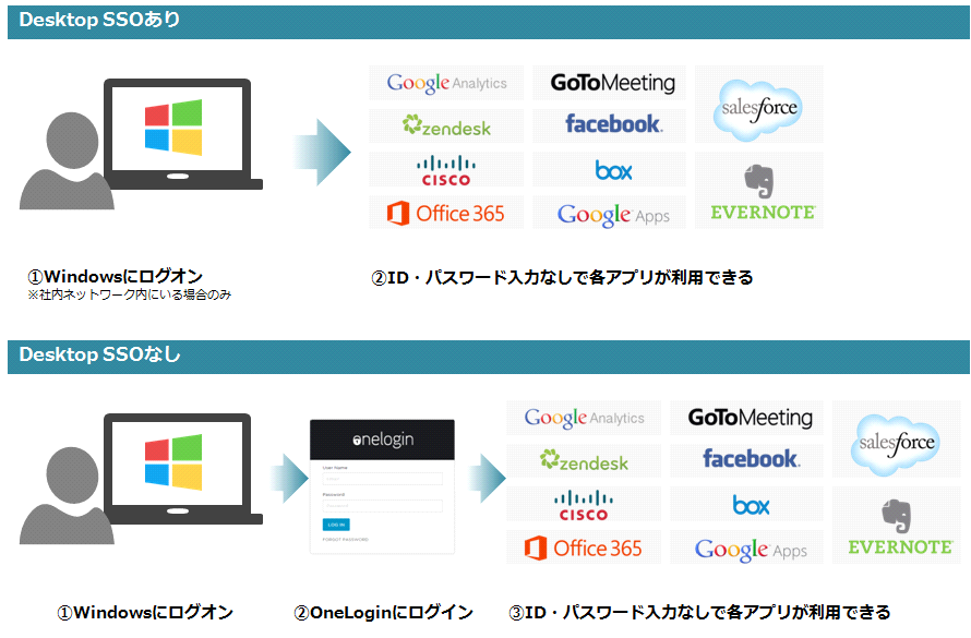 社内ネットワークにActive DirectoryのドメインユーザーでWindowsログオンをすれば、Windows統合認証機能よりOneLoginポータルサイトでID・パスワードを入力することなく、シングルサインオンが利用できるDesktop SSOを提供します。Desktop SSOを利用することで、出社後にWindowsログオンするだけで、以降は一切ID・パスワードの入力が不要になります。