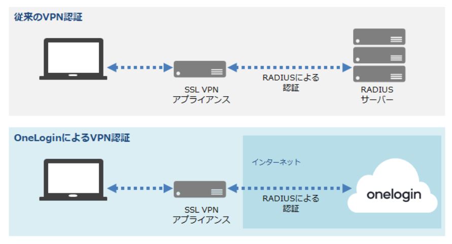 OneLoginのRADIUSサーバー機能を利用すれば、OneLoginがクラウド上に存在するRADIUSサーバーとして機能するため、従来VPNの認証で利用されてきたオンプレミスのRADIUSサーバーが不要になります。