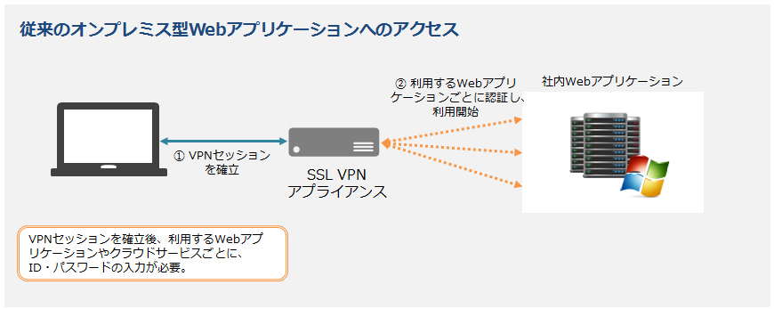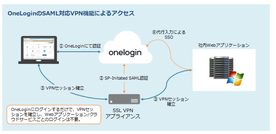 SAMLに対応したSSL VPNゲートウェイをOneLoginと連携させることで、リモートアクセスユーザーがファイアウォールの内側にあるWebアプリケーションにアクセスする際の利便性を向上できます。